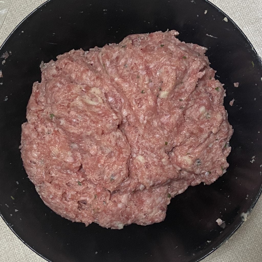 Dans un grand bol, mettons la viande hachée de porc et de veau