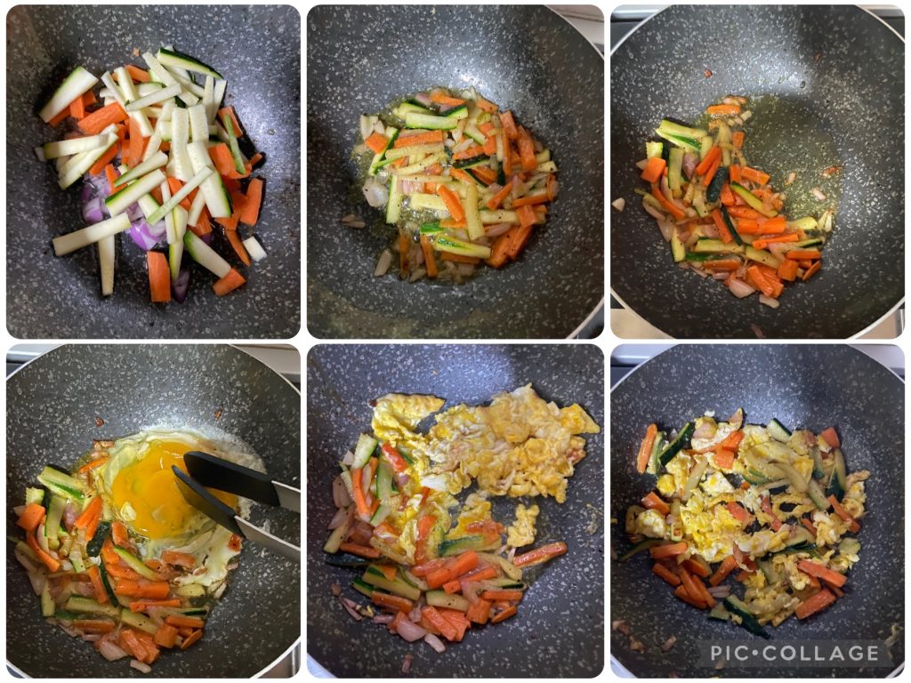 Une fois cuit, mélangeons l’œuf et les légumes.