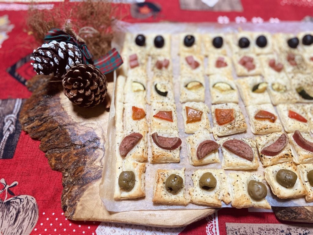Vous pourrez les garnir avec des ingrédients que vous avez déjà dans le frigo. J’ai utilisé quelques olives, saucisse, jambon cuit, poivrons et courgettes. C’est un élégant VIDE-FRIGO parfait pour les fêtes de Noël car cette recette vous permet de préparer les bouchées à l’avance et de les servir à l’arrivée de vos invités.