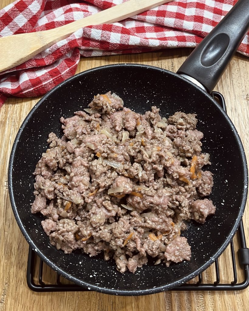 Dans une grande poêle, mettez un filet d’huile d’olive extra vierge et ajoutez carotte, oignon et pomme de terre râpés avec la saucisse pelée et la viande hachée.