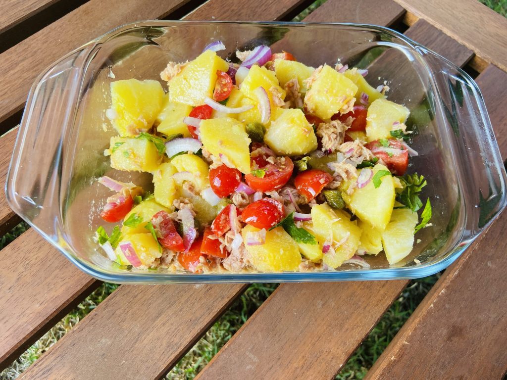 • Notre salade de pommes de terre est prête. Servir froide ou tiède.