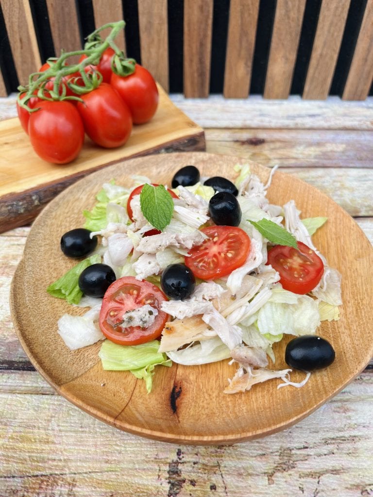 • Notre Salade de poulet grillé est prête. Décorons avec quelques feuilles de menthe pour donner une touche de fraîcheur.