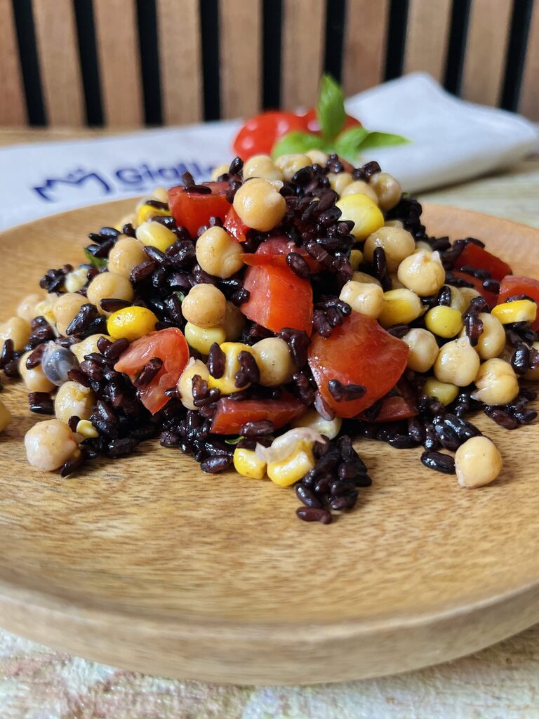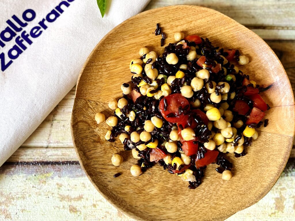 La salade de riz vénéré avec pois chiches, maïs et tomates cerises est l’un de mes plats d’été préférés. Fraîche, légère et complète, je la prépare souvent quand j’ai des amis à dîner ou lorsque j’ai besoin de quelque chose de pratique à emporter au bureau ou à la plage.