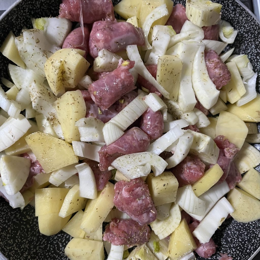 Dans une large poêle, chauffons une cuillère d’huile d’olive extra vierge. Ajoutons la saucisse avec les fenouils et les pommes de terre et laissons imprégner pendant quelques minutes.