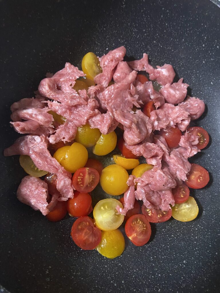 Émiettons la saucisse de poulet directement dans la poêle et ajoutons les tomates cerises coupées en deux.