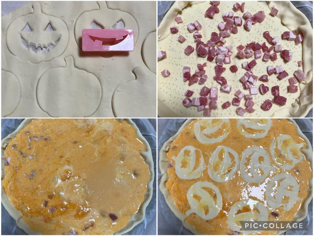 Déroulons le deuxième rouleau de pâte feuilletée et, à l’aide d’un emporte-pièces thématiques, découpons des potirons. Badigeonnons-les avec le jaune d’œuf battu et posons-les sur la surface de notre tarte.