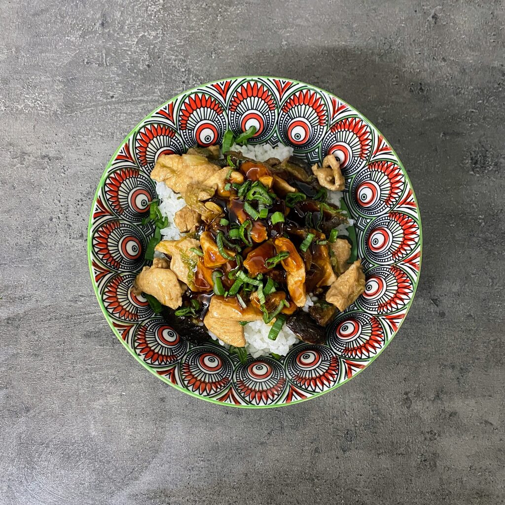 Grâce à cela, je parviens, à mon petit niveau, à reproduire à la maison des idées culinaires parfois réinterprétées par moi-même sans suivre de recettes spécifiques, je me fie donc à l’intuition et à ce que la cuisine comme base te permet de faire. Dans cette recette, je te propose du poulet doré avec des ciboules puis complété avec des champignons shiitake et garni de sauce teriyaki. Comme base sous l’assaisonnement, j’ai mis du riz cuit à la vapeur parfumé au vinaigre de riz reproduisant un bol typiquement oriental à déguster!