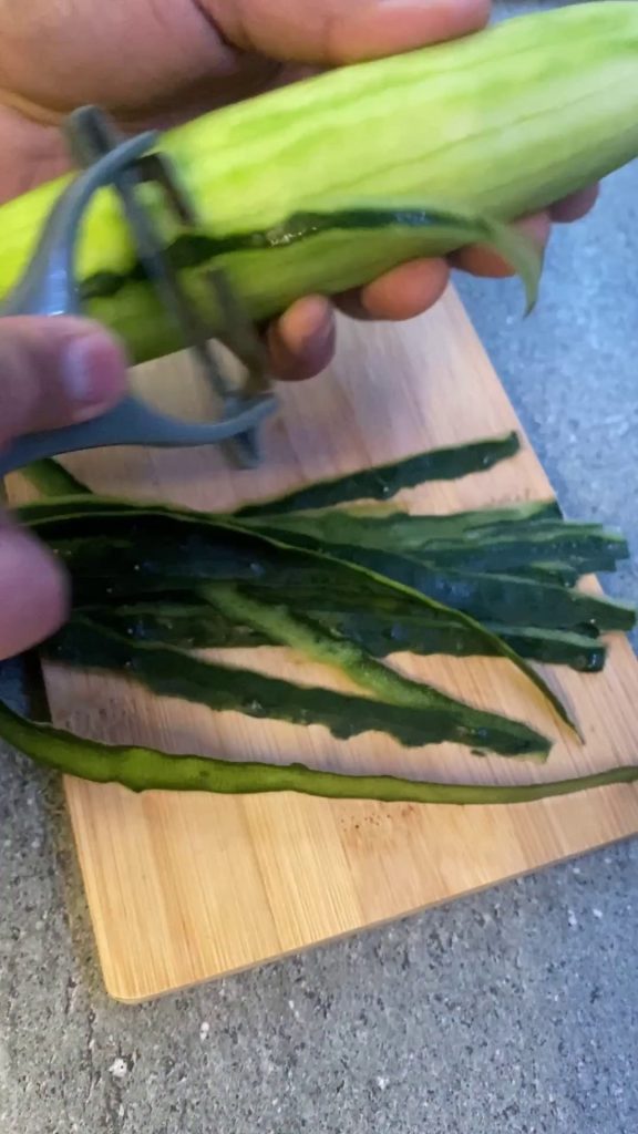 Tout d’abord, épluche le concombre en enlevant donc la peau extérieure