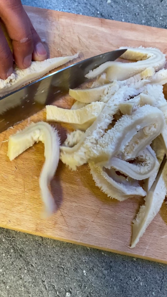 Tout d’abord, lave sous l’eau courante les tripes précuites et laisse-les égoutter pendant quelques minutes, puis coupe-les en lamelles