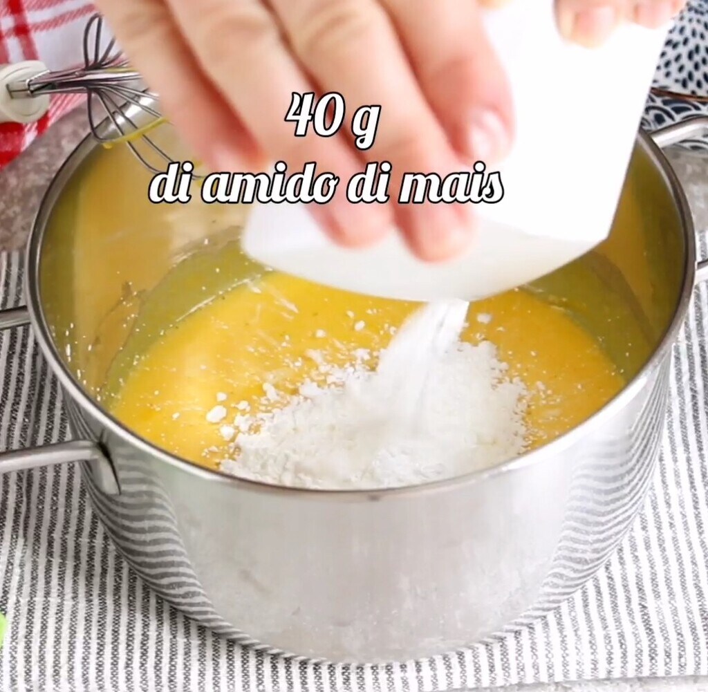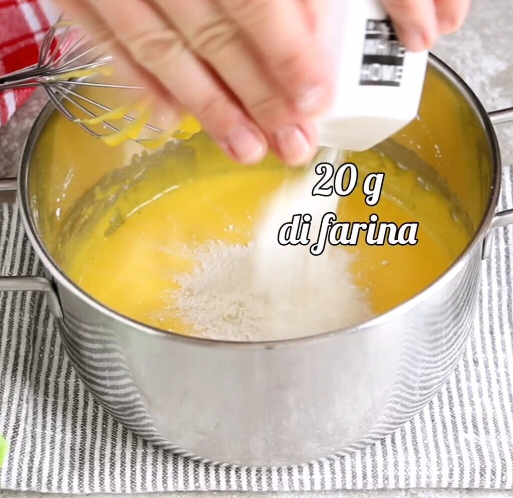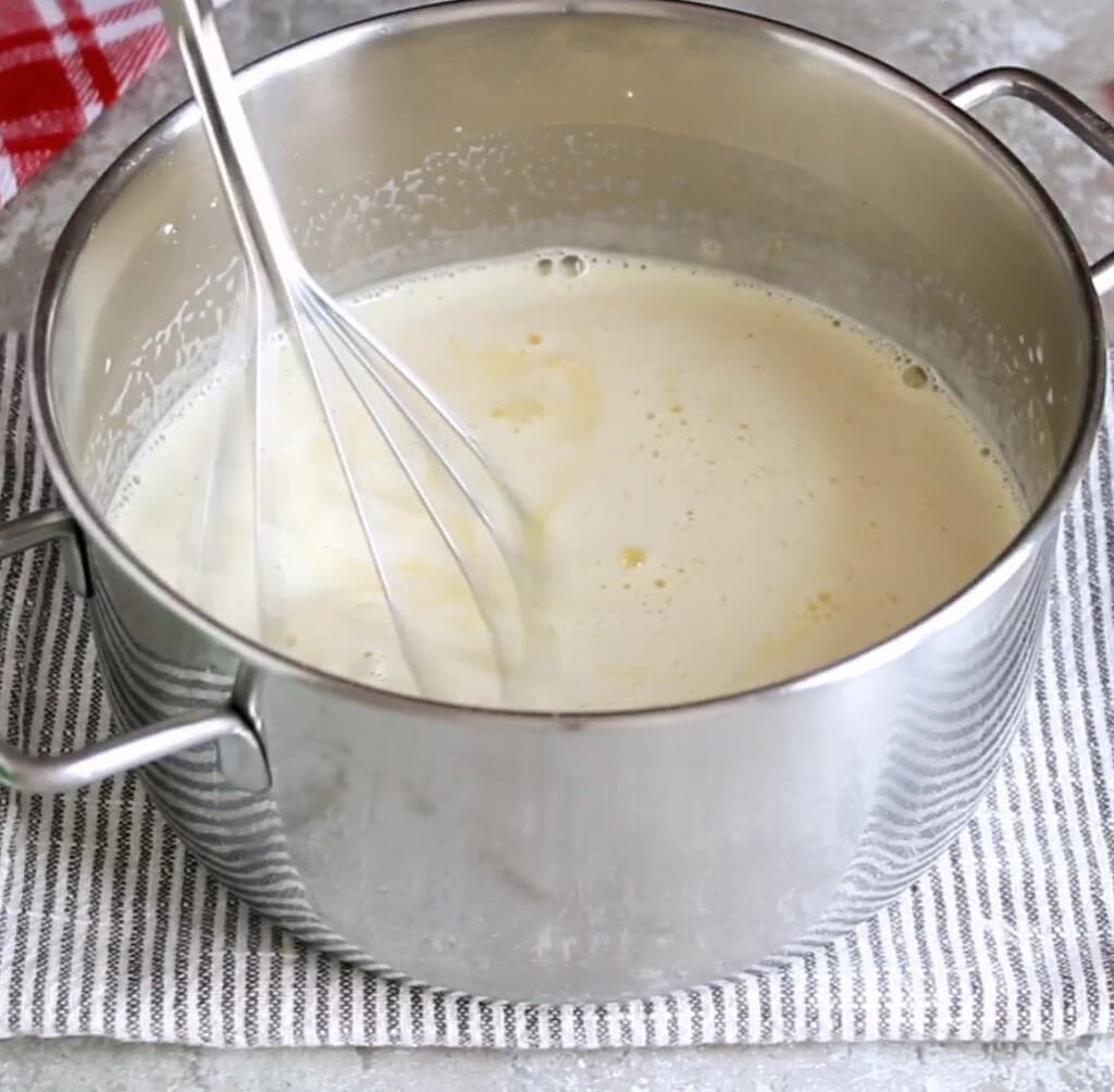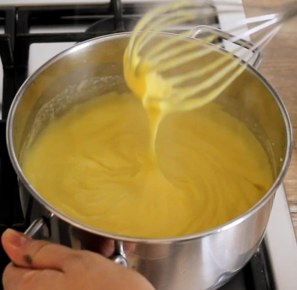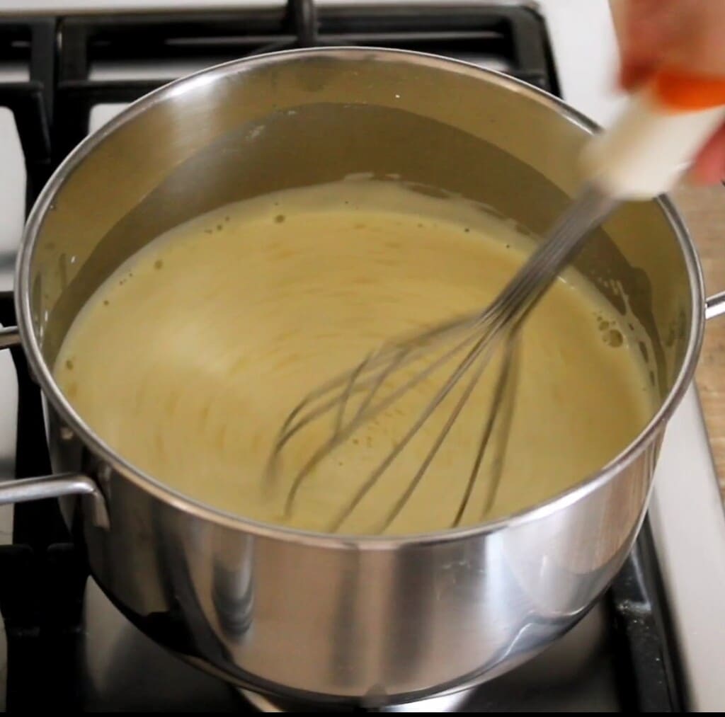 Portez la casserole sur le feu, à feu moyen-élevé, et commencez à mélanger toujours avec le fouet à main, pendant environ cinq minutes. Habituellement, dès que je vois que la crème commence à s’épaissir, je baisse le feu au minimum pour éviter qu’elle ne s’épaississe trop rapidement et ne commence à brûler au fond.