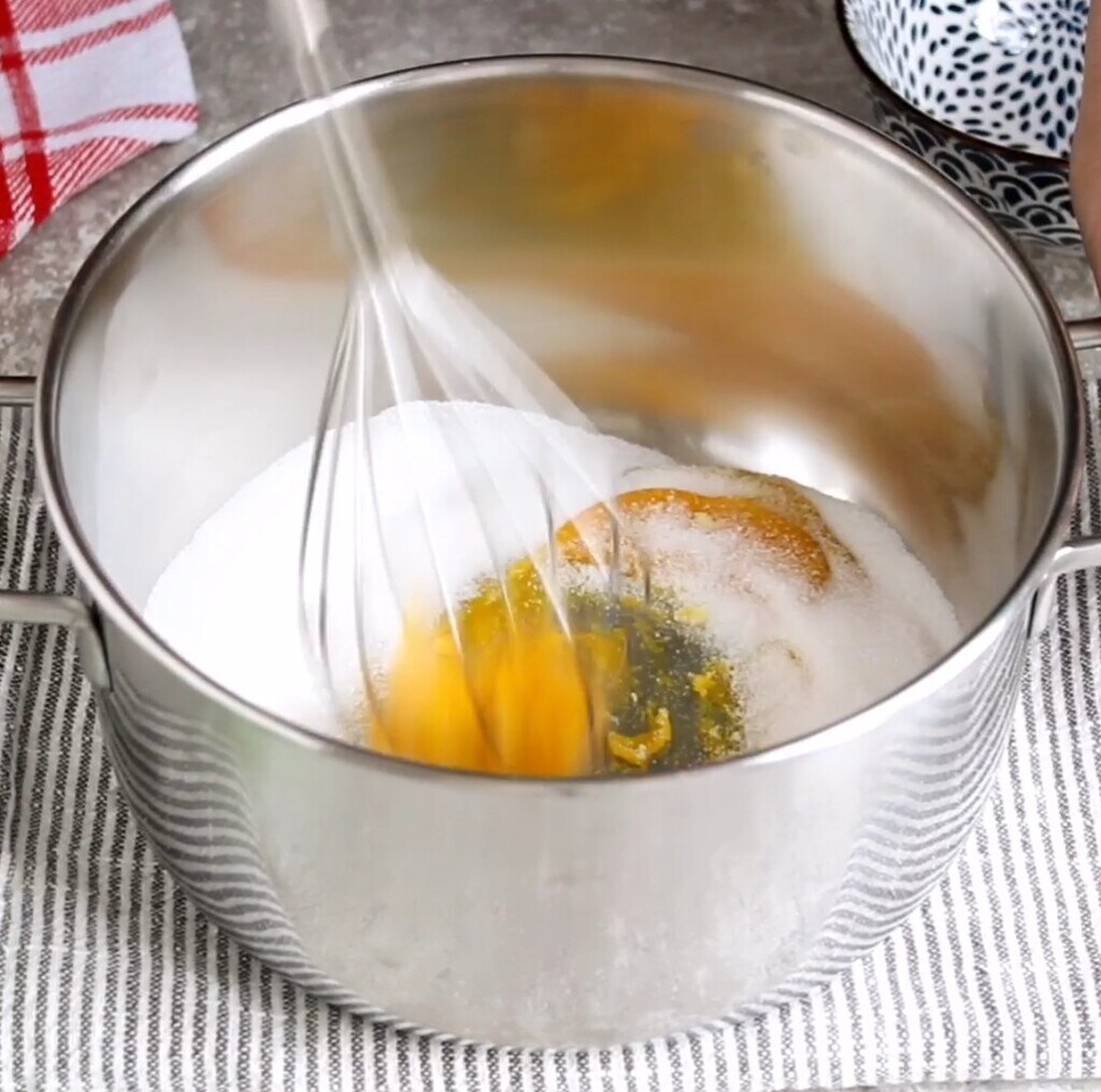 Ajoutez le sucre et mélangez énergiquement avec un fouet à main, jusqu’à obtenir un mélange homogène.
