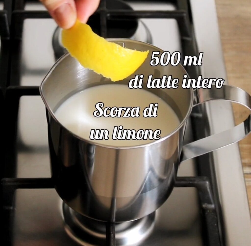 Versez le lait dans une casserole, mettez-le sur le feu et ajoutez le zeste de citron et, si vous le souhaitez, les graines d’une gousse de vanille. Portez le lait à frémissement, puis éteignez le feu.