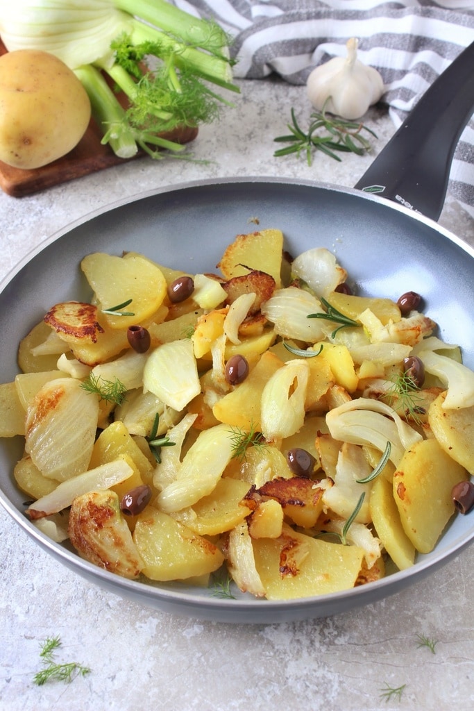 Arrosez une poêle antiadhésive avec un peu d’huile d’olive extra vierge, ajoutez l’ail sans sa peau et faites dorer pendant quelques secondes ; ensuite versez les fenouils et les pommes de terre, salez, poivrez (facultatif) et faites cuire pendant quelques minutes, en mélangeant de temps en temps, jusqu’à ce que les pommes de terre et les fenouils soient légèrement dorés.