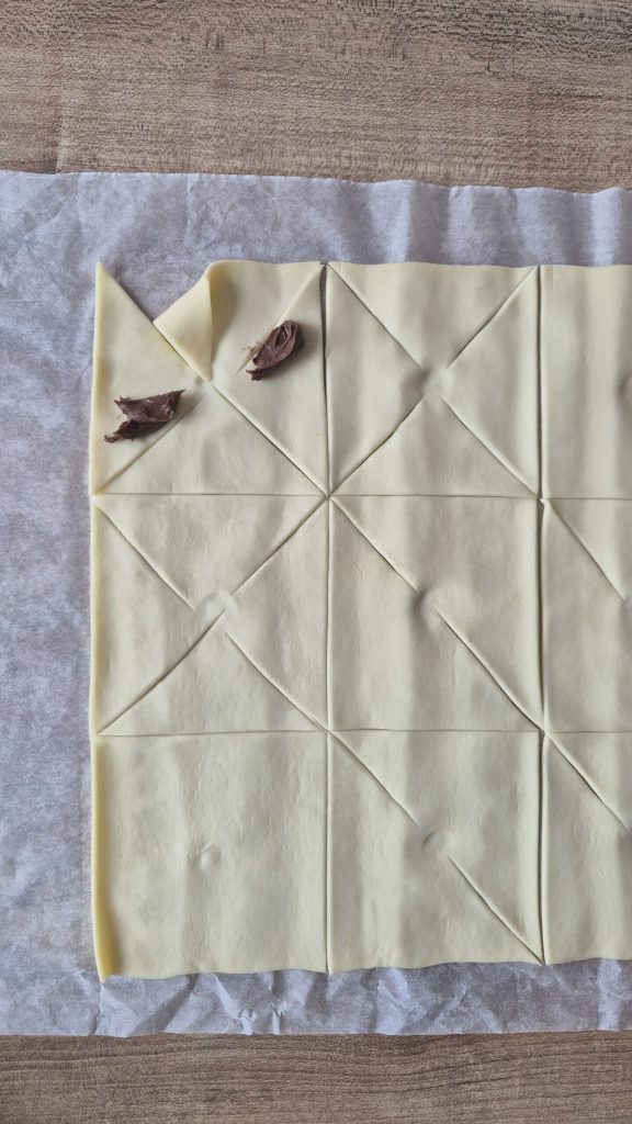 À ce stade, vous pouvez choisir d’ajouter une petite quantité de Nutella sur les deux petites hélices qui seront fermées, ou les laisser vides.