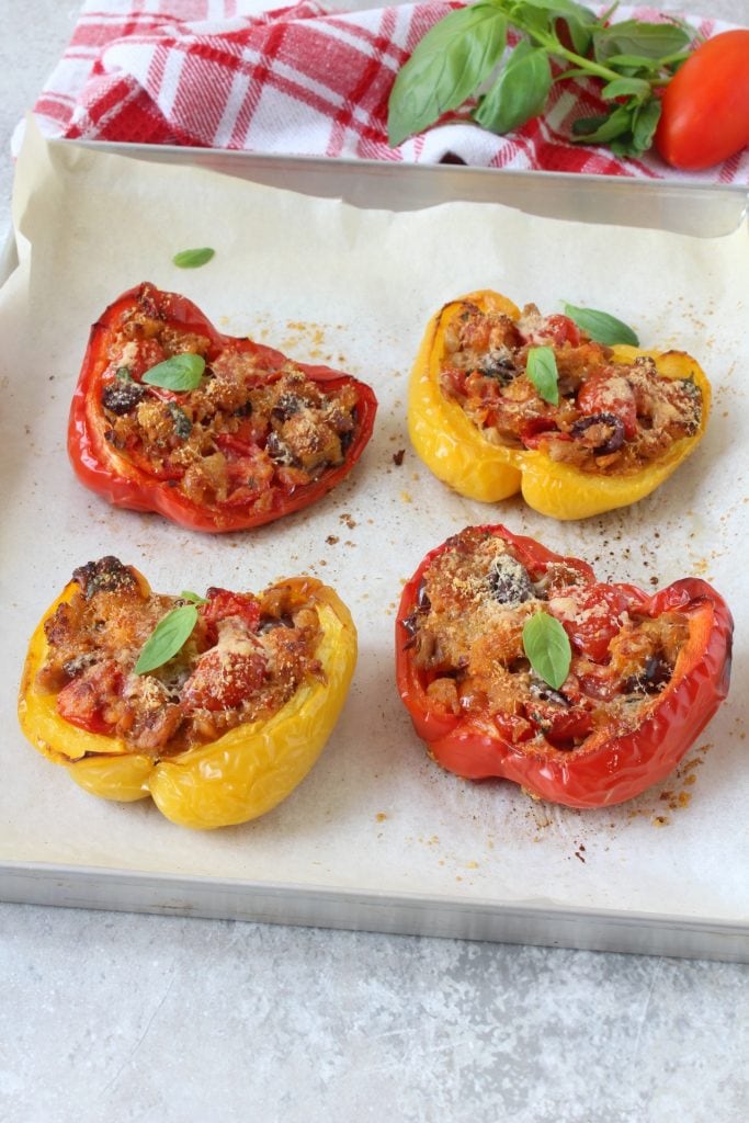• Répartissez un peu de parmesan sur la surface de la farce ou, si vous n’aimez pas l’association thon-parmesan, remplacez-le par un peu de chapelure; ajoutez encore un filet d’huile et mettez vos poivrons farcis à nouveau au four, toujours à 200°C pendant environ 20 minutes.