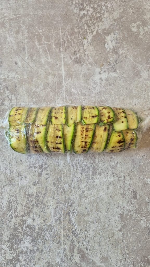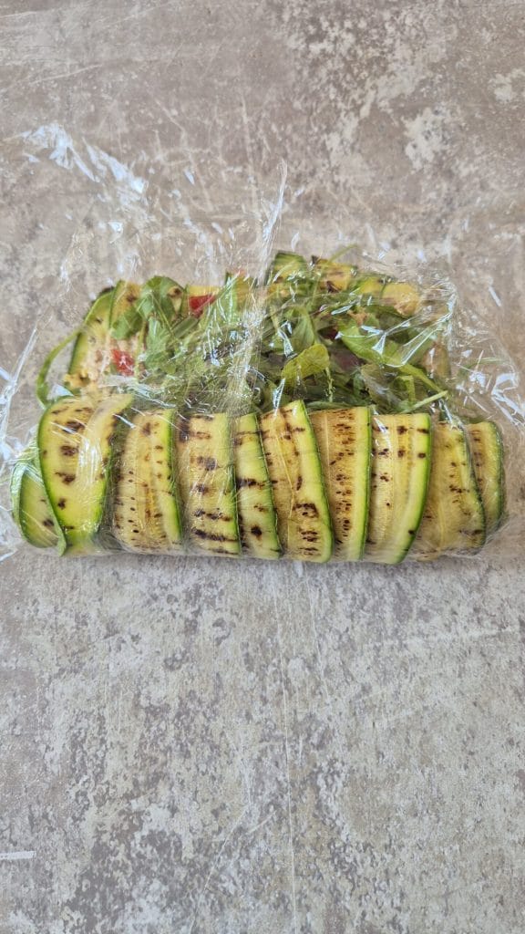 Terminez le tour, fermez le film en ‘bonbon’ qui est resté sur les bords de votre roulé froid de courgettes et placez-le au réfrigérateur pendant 1-2 heures avant de le servir.