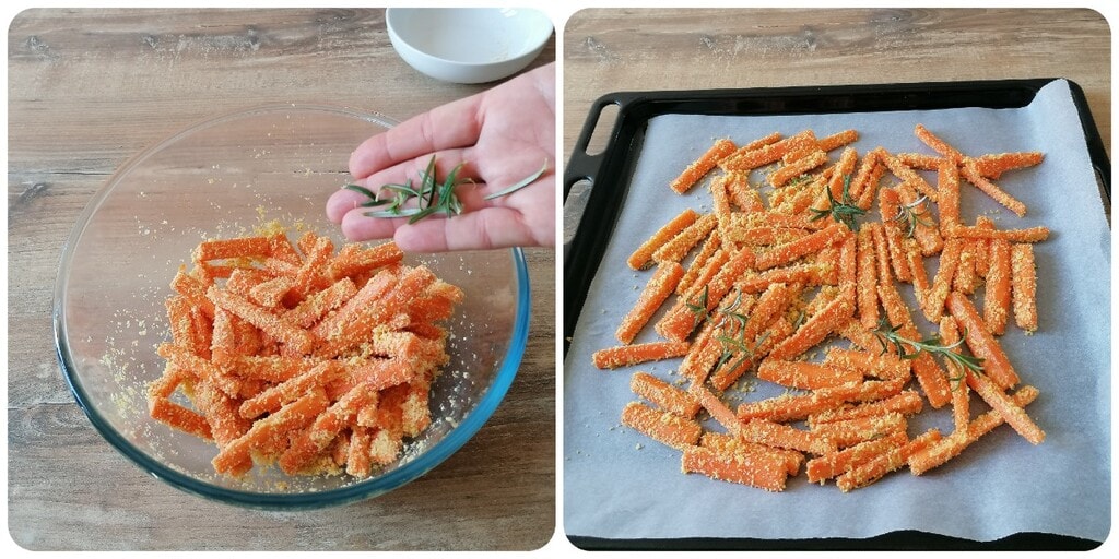 Les carottes, cuites au four, deviendront très douces, tandis que la chapelure et le parmesan apporteront le croquant. Le romarin, enfin, donnera la touche qui fera la différence.