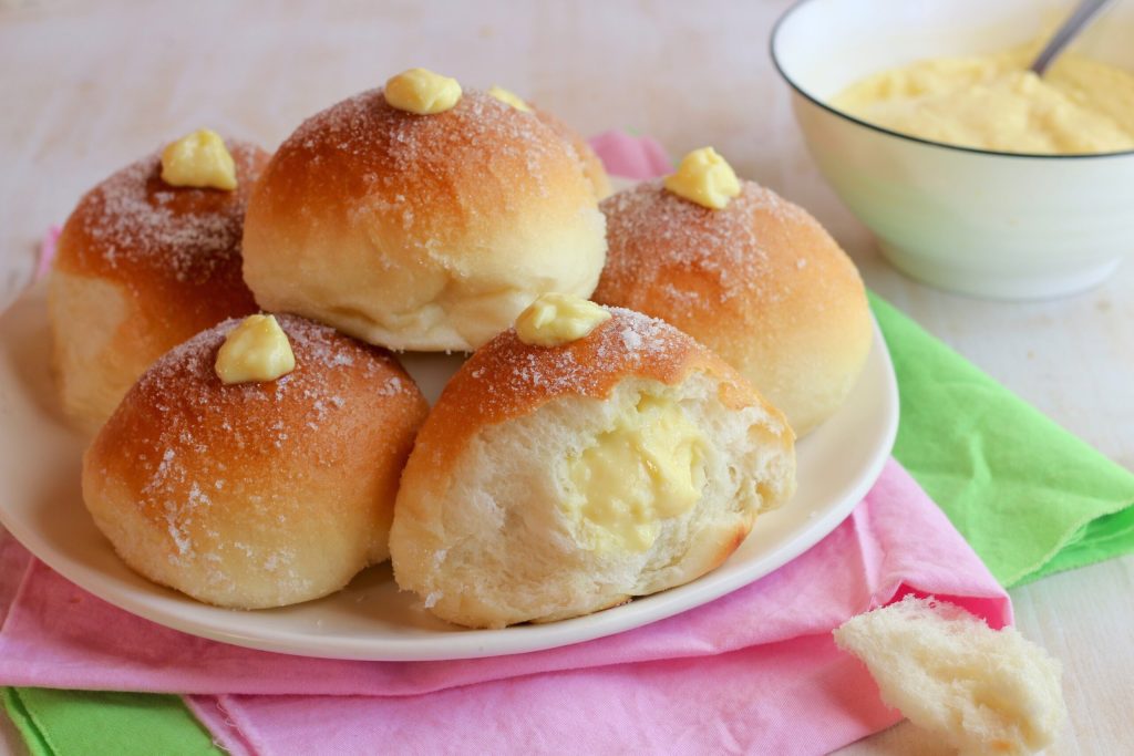Lorsque les petits pains seront bien gonflés, enfournez-les dans un four déjà chaud à 180° pendant environ 25 minutes, avec un four statique. Dès la sortie du four, badigeonnez-les de beurre fondu et roulez-les dans le sucre en poudre. Aidez-vous d’une poche à douille pour les garnir de crème pâtissière froide.