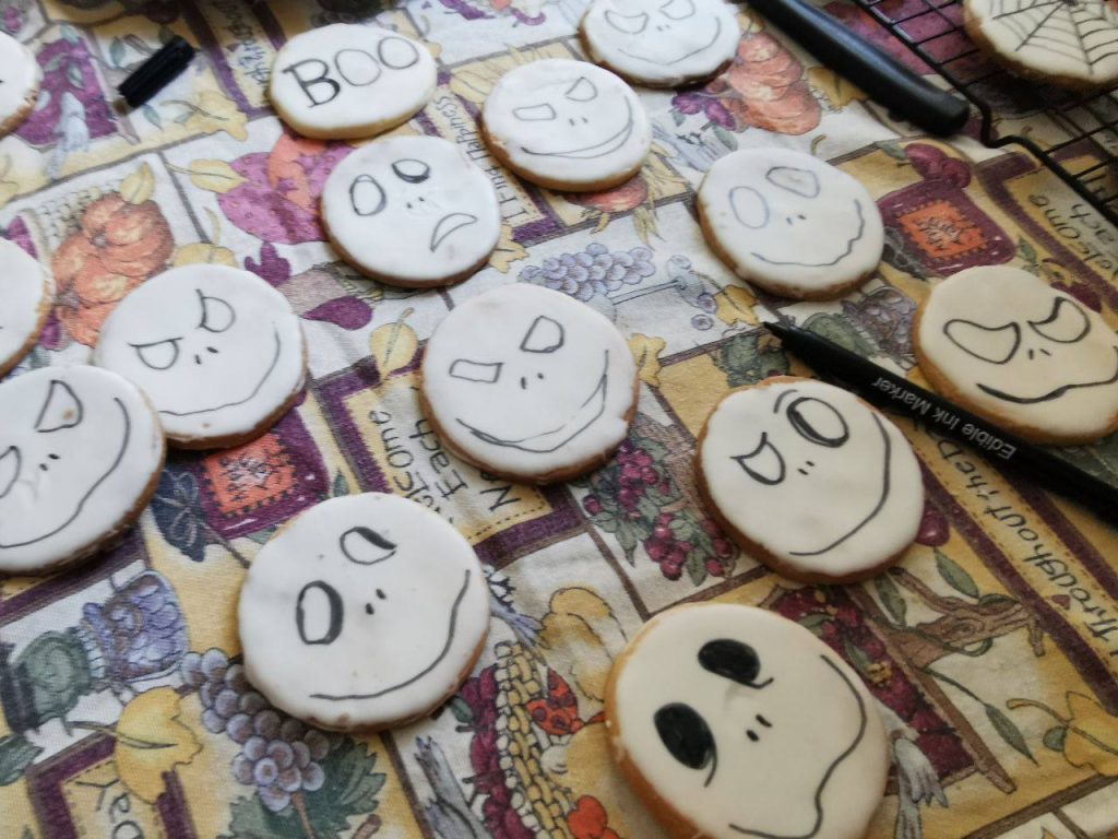 • Avec un feutre alimentaire noir, dessinez des visages effrayants, des toiles d’araignée, des momies. Sur ces biscuits, vous trouverez différents exemples. Vous pouvez aussi demander aux enfants de vous aider à les finaliser. Amusez-vous bien