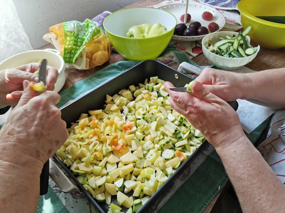Entre-temps, occupons-nous des légumes, lavons-les, pelons-les et coupons-les en morceaux. Mettons-les dans une plaque avec un peu d’huile