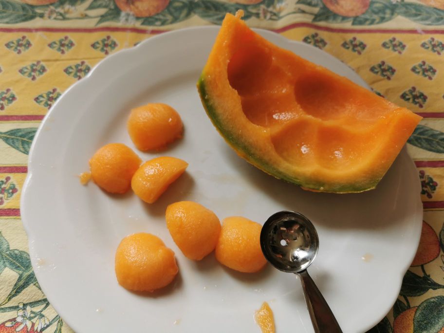 En très peu de temps, vous aurez une délicieuse petite recette, parfaite aussi pour un buffet. L’été, selon moi, demande des plats frais, riches en fruits de saison, et sans cuisson, dans la mesure du possible, légers mais savoureux. Vous pouvez créer différentes combinaisons, avec des fromages, comme la feta, le primosale, et des charcuteries, comme la mortadelle, le salami de Milan, et utiliser des abricots ou des pêches à la place du melon.