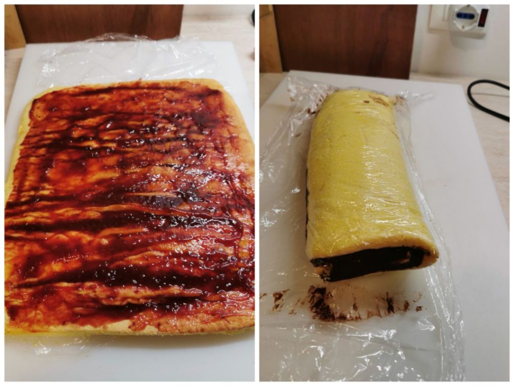 Commençons par dérouler délicatement la bûche, ajoutons une fine couche de confiture, laissons 1 cm de bord sur les côtés. Mettons par-dessus la ganache, en l’étalant avec une spatule, laissons toujours un peu de marge. Roulez serré, mais sans trop presser. Fermez et scellez dans un film chaque côté du dessert, laissez reposer à température pendant 2/3 heures