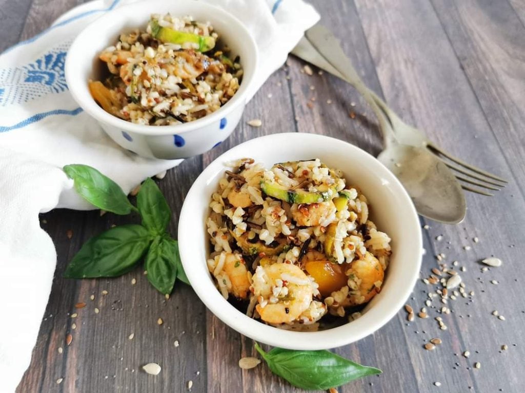 CÉRÉALES ANCIENNES AVEC CREVETTES ET LÉGUMES, une recette née du besoin de quelque chose de frais et rapide à faire pour la saison estivale.