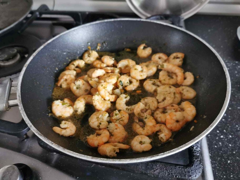 Occupons-nous maintenant des crevettes, lavées, nettoyées et décortiquées. Faisons-les revenir à la poêle pendant quelques minutes avec de l’huile, une gousse d’ail, que nous retirerons ensuite, de la sauce soja, du persil frais haché, des épices
