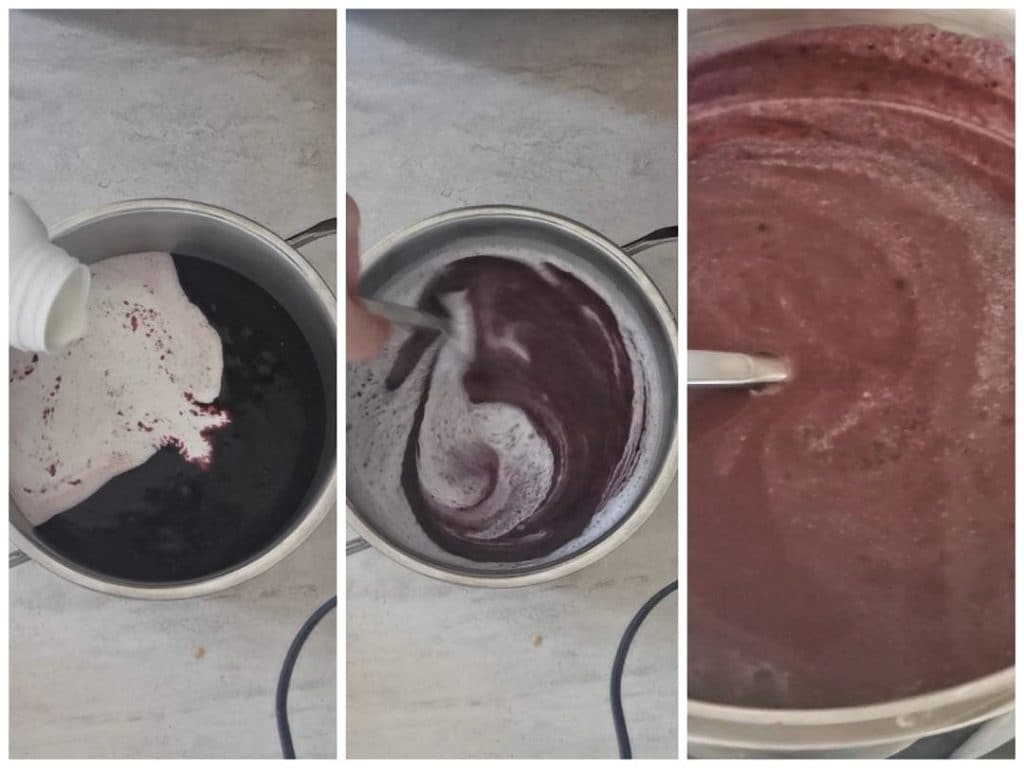 Versons le smoothie dans une casserole, ajoutons la crème et portons à ébullition. Ajoutons la gélatine bien essorée, mélangeons jusqu’à ce qu’elle soit dissoute. Laissons tiédir