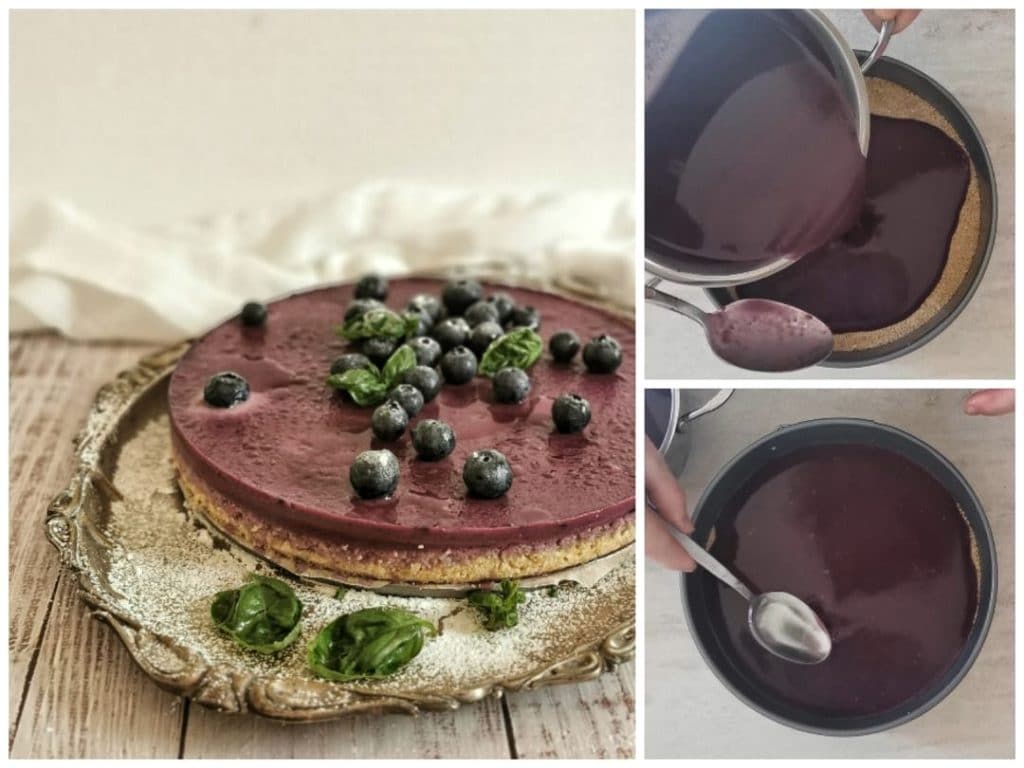 Cheesecake aux myrtilles et au basilic, un délicieux gâteau froid aux fruits et aux herbes fraîches.