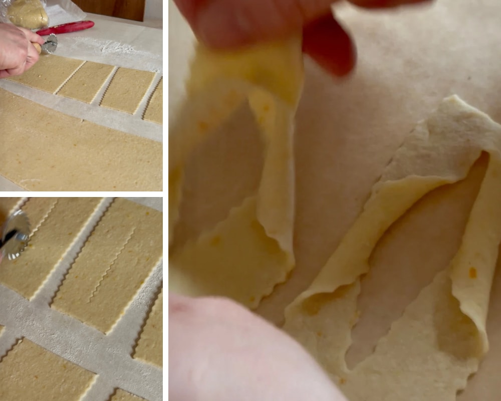 Sur un plan de travail, étalez la pâte avec un laminoir et coupez-la à une épaisseur de 3/4 mm. Découpez des rectangles avec une roulette dentelée, étalez-les sur une plaque recouverte de papier cuisson, et faites une incision au centre du rectangle avec la roulette. Avec vos mains, tournez les rectangles de pâte sur eux-mêmes, de manière à enrouler les bords.