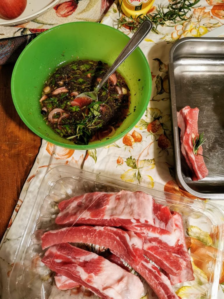 Prenez les côtes, faites de petits trous dans la viande et insérez-y des morceaux d’ail et des feuilles de romarin, puis badigeonnez-les de moutarde. Transférez les côtes dans un plat antiadhésif, couvrez-les de marinade, tournez-les bien et massez-les avec le liquide, puis couvrez le plat avec du film alimentaire et mettez-le au réfrigérateur pendant au moins 3 heures.