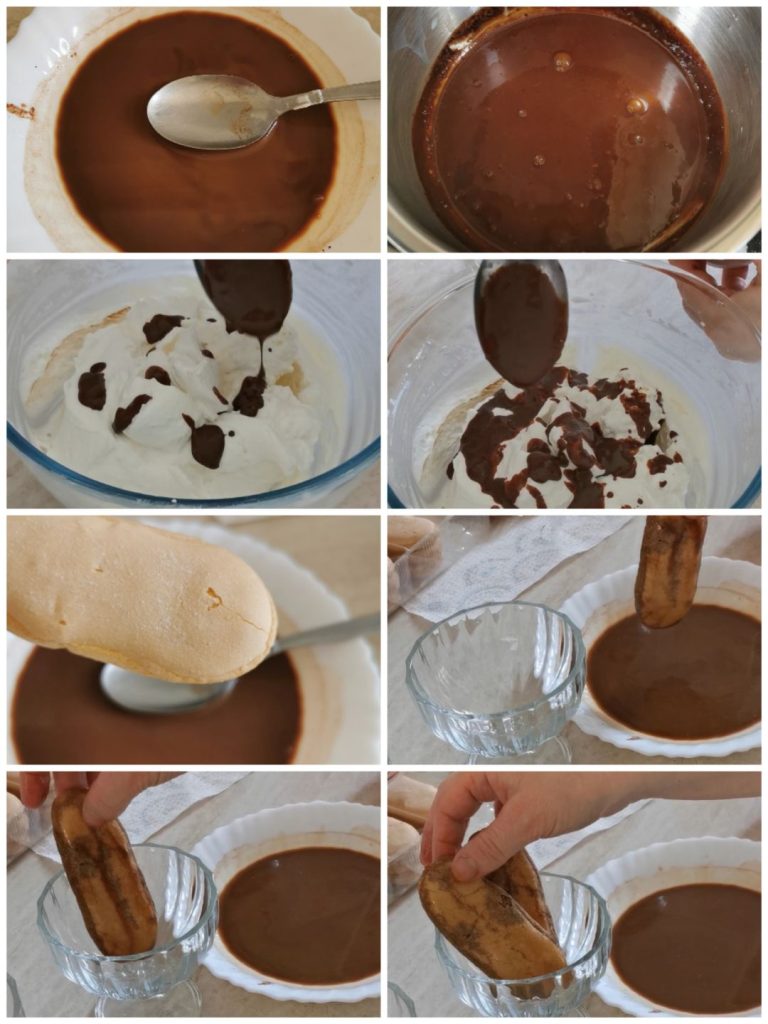Dans un bol versez 130 ml de café froid, 100 ml de liqueur, et une cuillère à café de cacao en poudre, mélangez bien. Dans un autre bol, versez le reste du café, une cuillère de liqueur et le reste de cacao, mélangez. Versez un peu de la sauce obtenue sur la crème de mascarpone et crème. Ensuite, trempez rapidement 2 biscuits, des deux côtés, dans l’autre bol et placez-les dans une coupe, appuyés sur le bord.