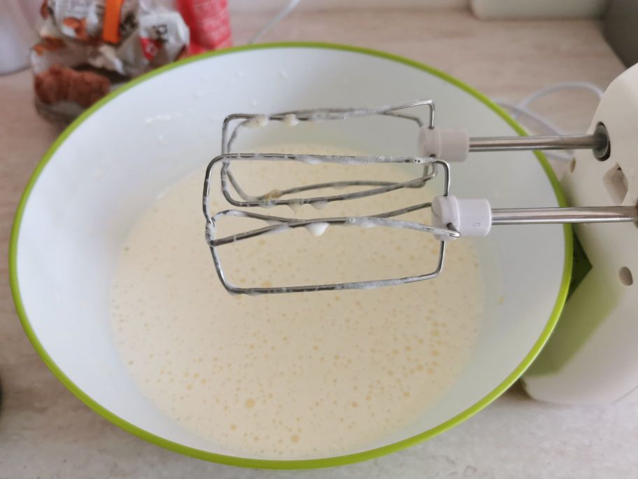 Commençons par tamiser la farine et la levure dans un bol. Dans un autre bol, battons les œufs avec le sucre avec un fouet électrique, puis ajoutons progressivement l’huile et le lait, et mélangeons bien le tout