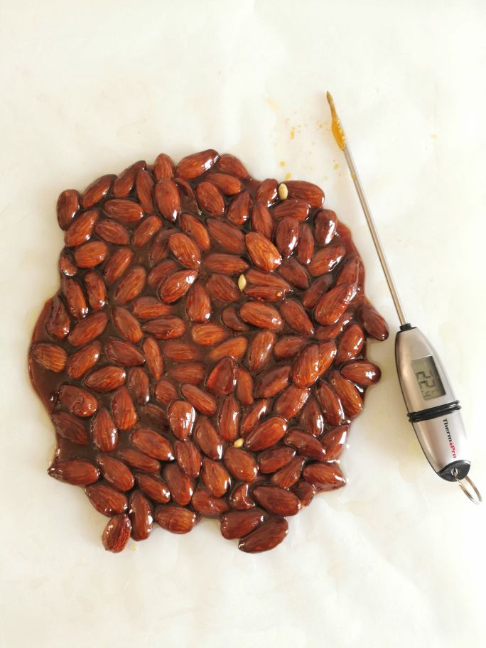 • Laissez cuire le sucre jusqu’à ce qu’il atteigne la température d’environ 170° (pour acheter un thermomètre alimentaire, vous pouvez cliquer ici), et commence à devenir foncé. Pendant ce temps, chauffez les fruits au four, pendant quelques minutes, puis versez-les dans le caramel. Mélangez pour bien incorporer les fruits secs au caramel, cela prendra de 2 à 5 minutes, puis éteignez le feu