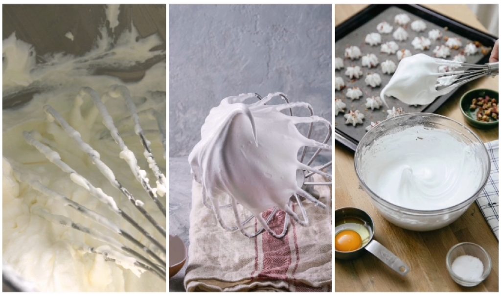 Préparation de la meringue : préchauffer le four à 100°, en attendant, tapisser une plaque de papier cuisson. Dans un bol, monter les blancs d’œufs en neige avec les fouets électriques, ajouter le sucre en poudre petit à petit et continuer à monter, pendant environ 10 minutes. Une fois prêt, ajouter le sucre glace, en mélangeant délicatement de haut en bas, jusqu’à obtenir un mélange lisse et brillant.