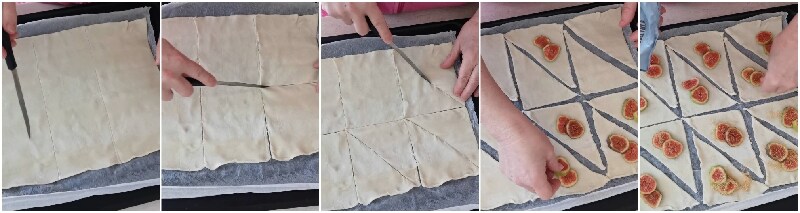 Étalez la pâte feuilletée, coupez-la en triangles et décorez avec des tranches de figues, une pincée de sucre, enfournez et les voilà prêts à déguster, avec un thé, peut-être accompagnés d’une boule de glace ou d’une cuillerée de crème pâtissière, un délice.
