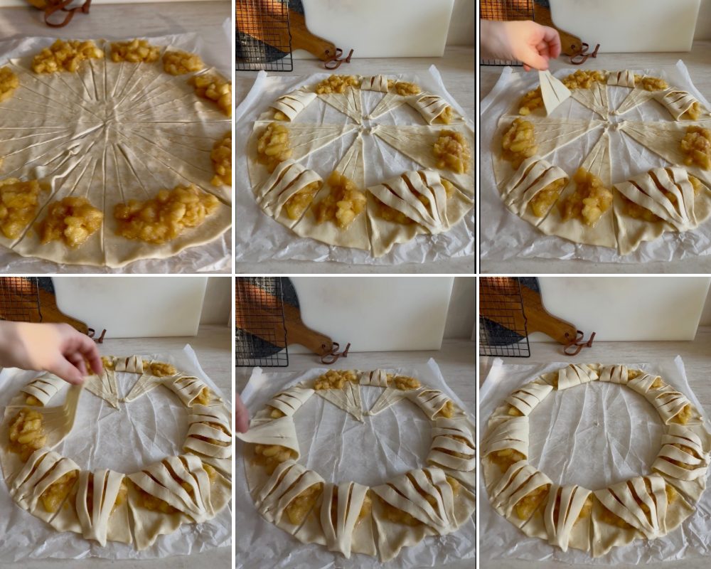 Tressez : Roulez la part de la pointe vers la base, en entourant le mélange de pommes. Les incisions s’ouvriront légèrement, créant l’effet « tressé » ou « éventail » au-dessus de la garniture, transférez les douceurs sur une plaque.