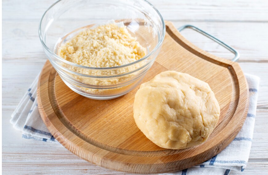 Dans le robot, mettez la farine tamisée, ajoutez le beurre mou, le sel, les jaunes d’œufs, et avec un peu d’eau froide, en utilisant le crochet feuille, pétrissez comme une pâte sablée. Une fois prêt, mettez le pâton au réfrigérateur, enveloppé dans un film plastique, pendant environ une demi-heure