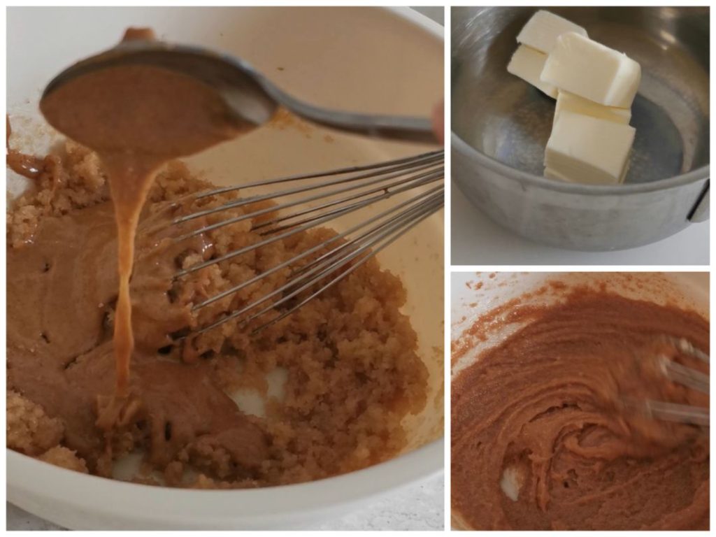 Commencez par faire fondre le beurre dans une casserole, à feu doux, et laissez tiédir. Dans un bol, mettez le sucre de canne, ajoutez le beurre fondu et la crème d’arachides, mélangez bien le tout.