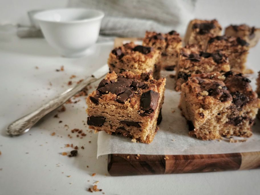 Transférez le tout dans le moule carré de 20 cm, recouvert de papier sulfurisé, parsemez le chocolat restant sur la surface du gâteau et enfournez pour environ 30/35 minutes à 170°. Une fois prêt, laissez refroidir et coupez en carrés.