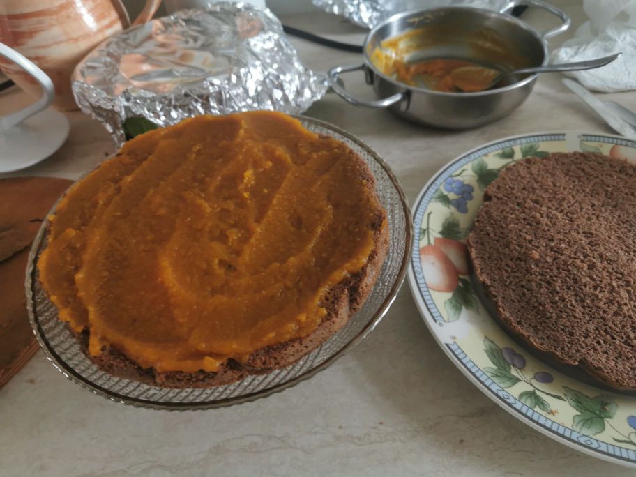 Une gourmandise chocolatée garnie d’une crème de potiron, vraiment fantastique. L’association chocolat et potiron fonctionne à merveille, et elle est devenue un incontournable parmi les gâteaux à refaire. Les couleurs et le parfum de ce gâteau sont une image de l’automne. Si on me demandait de choisir une recette automnale, je referais celle-ci mille fois.