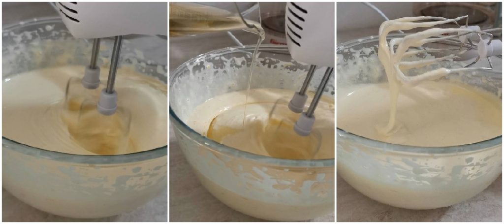 Commencez par battre avec les fouets électriques, pendant environ 5 minutes à haute vitesse, les œufs avec le sucre, le zeste râpé du citron et la vanille. Vous devez obtenir un mélange mousseux, clair et d’un volume triplé. Ensuite, tout en battant avec les fouets, ajoutez l’huile en filet, puis le yaourt, mélangez bien. Vous obtiendrez une crème assez liquide.