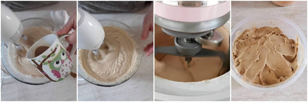 Mélangeons avec un mixeur plongeant, un fouet à main ou électrique, j’ajoute l’espresso, je mélange bien. Continuons à mélanger jusqu’à atteindre 85° pendant quelques minutes, puis retirons du feu et laissons refroidir à 4°, maintenant je verse la glace dans un récipient qui peut être mis au réfrigérateur, pendant 8/10 heures. À ce stade, elle peut être turbinée dans la sorbetière jusqu’à ce qu’elle épaississe. Servir