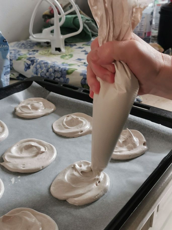 • Préchauffez le four à 100°C. Préparons la meringue française. Une fois prête, mettez la meringue dans une poche à douille et formez 8 disques de meringue de 8 cm de diamètre sur une plaque de cuisson recouverte de papier sulfurisé. Cuire pendant environ 1 heure et demie, laissez refroidir dans le four avec la porte entrouverte. Retirez la meringue et disposez-les sur 4 petites assiettes.