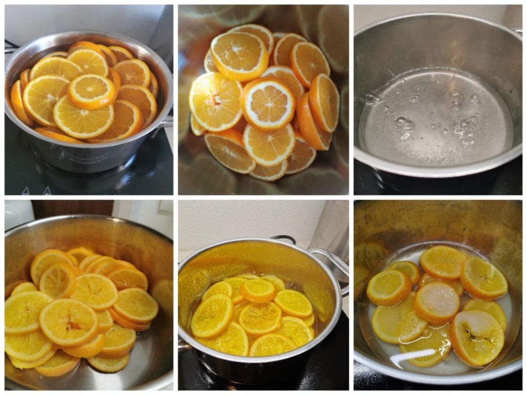 Préparons les oranges : Préparons les oranges confites : Lavez et coupez les oranges en tranches, mais en deux moitiés, d’une épaisseur de 4 mm, et mettez-les dans une casserole avec de l’eau froide. Portez à ébullition et dès que ça bout, éliminez l’eau, répétez cette opération 3 fois. Dans la même casserole, ajoutez l’eau, le sucre et le glucose, portez à ébullition. Remuez délicatement, maintenez le feu modéré et écumez si nécessaire. Poursuivez la cuisson pendant 15 minutes. Éteignez et laissez refroidir. Remettez à ébullition, attendez 3 minutes et éteignez. Laissez refroidir, laissez la casserole au réfrigérateur pendant au moins 8 heures