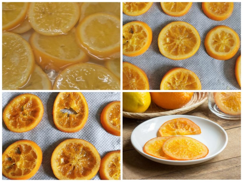 Je continue : Remettez les oranges et le sirop à ébullition, en poursuivant la cuisson pendant environ 1 heure, jusqu’à obtenir un sirop épais et des tranches d’orange translucides. Égouttez les tranches d’orange et laissez-les sécher sur une plaque antiadhésive pendant environ 12 heures. Filtrez le sirop que vous pouvez conserver au réfrigérateur dans des récipients stérilisés, il peut être utilisé comme sirop pour les gâteaux ou enrichir d’autres recettes. Pour accélérer le processus, vous pouvez enfourner les tranches d’orange à 110° pendant environ 1 heure. Bon appétit !