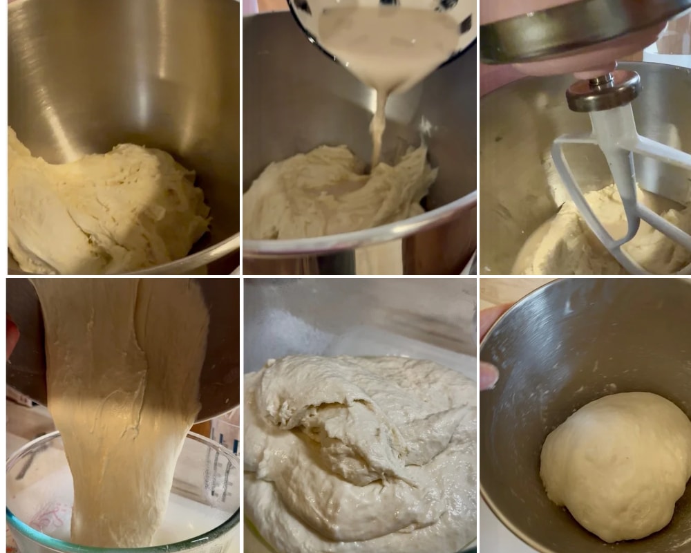 Dans un bol, (ou dans le pétrin avec le crochet feuille), mettez la farine, avec la levure de boulanger, et une partie de l’eau. Mélangez avec une cuillère, puis avec les mains jusqu’à obtenir une boule. Ajoutez ensuite le sel, le reste de l’eau, mélangez, (ou si vous utilisez le pétrin, changez pour le crochet pétrisseur), puis à la fin ajoutez l’huile et le sel. Reprenez le pétrissage jusqu’à obtenir une pâte lisse et homogène. Couvrez le bol avec du film plastique et laissez reposer au frigo pendant 12 heures.