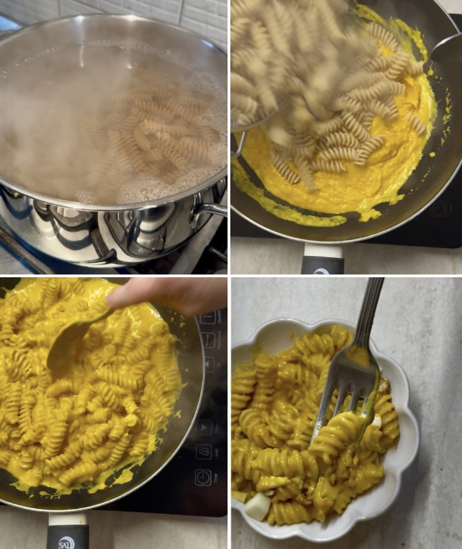 Mélange final : Faites sauter les pâtes dans la poêle avec la crème de courge, en ajoutant l’eau réservée si nécessaire.