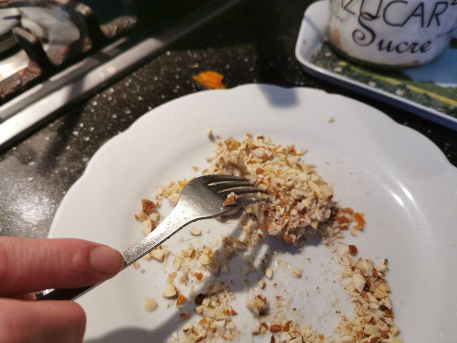 Retirez le poulet de la poêle, égouttez-le, et passez-le dans les amandes hachées, de manière à créer une panure tout autour de la viande, et voici notre poulet prêt